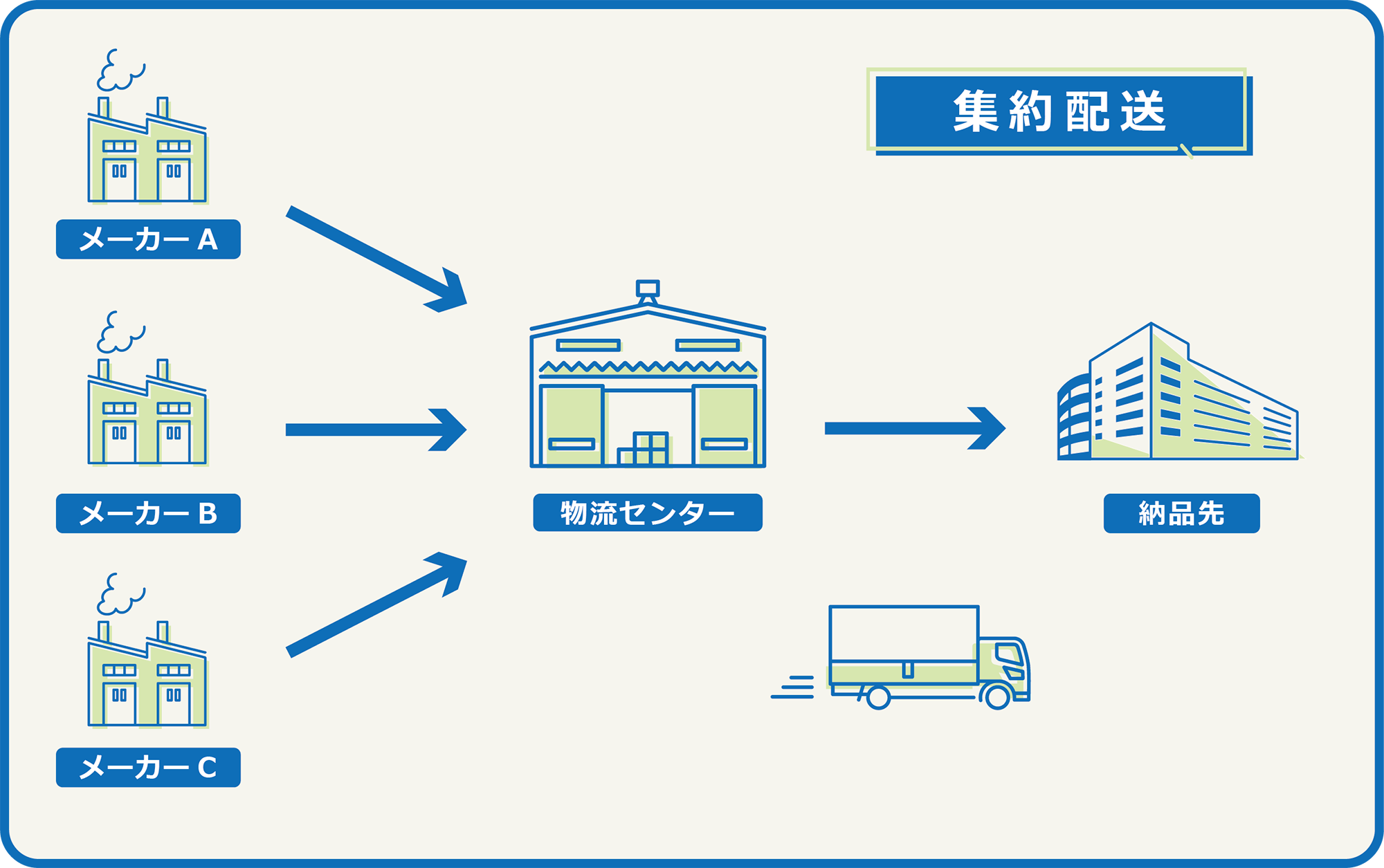 「集約配送」とは、複数のメーカーによる製品を一ヶ所に集め、まとめて納品先へ配送する仕組みのことです。配送ルートを合理化し、車両やドライバーの稼働回数を抑制。空荷スペースの削減にもつながり、効率的な配送を通じて環境負荷の軽減に貢献いたします。